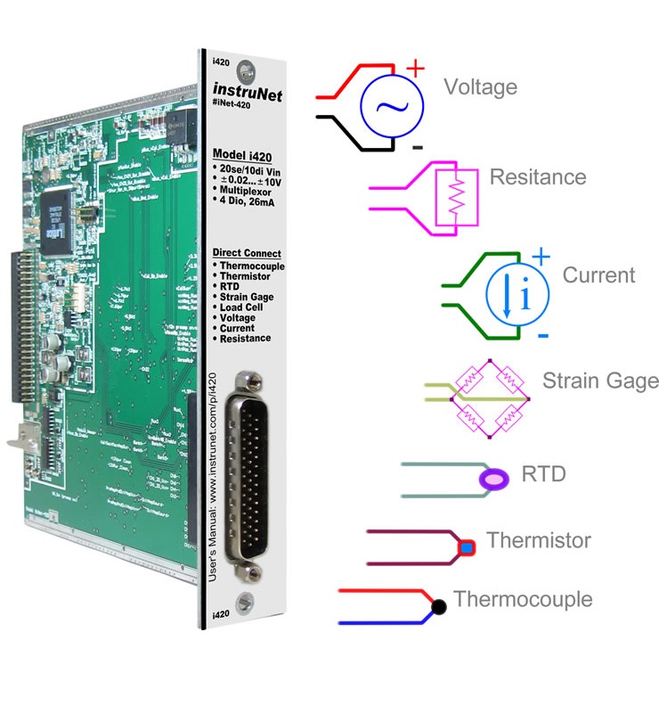i420卡插入4到16插槽的inunet i4xx卡笼,它又连接到Windows计算机20se/10di电压输入通道4 ×通用数字I/O (20mA接收器,-10V..30V)直接连接到传感器:电压,热电偶,热敏电阻,RTD,测压传感器,应变计,[…]