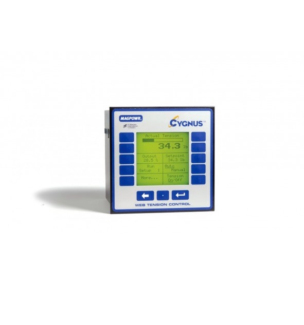 使用magpower的紧凑,强大的Cygnus®张力控制,各种先进但易于使用的功能是显而易见的立即操作人员。操作人员可以通过屏幕上显示的全文提示轻松导航高级张力控制功能和代码,使设置过程更快。使用多功能“智能键”(类似于自动柜员机中使用的键)和便于查看的大背光显示屏来维持或调整网张力。转换器和打印机可以大幅减少设置时间,并通过强大的功能,如自动调谐和圆辊补偿(以前只可能与舞者控制),提高一致性。复杂的张力设置可以通过全文提示快速输入,这与过去更复杂的输入程序相反。